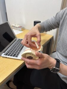 実際に模型を使いながら、正しいやり方や力加減を練習しました。ポイントは「やさしく行うこと」です。強くこすってしまうと、かえって歯ぐきを傷つけてしまうこともあります。